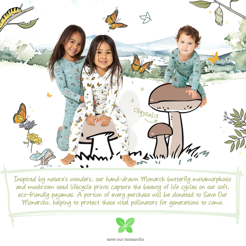 We’re thrilled to introduce our latest collection, inspired by the wonders of nature. Our hand-drawn Monarch butterfly metamorphosis and mushroom seed lifecycle prints bring the beauty of life cycles to our soft, eco-friendly pajamas. In loving memory of Maribeth, a portion of proceeds from every purchase will be donated to Save Our Monarchs, helping to protect these beautiful pollinators for generations to come.