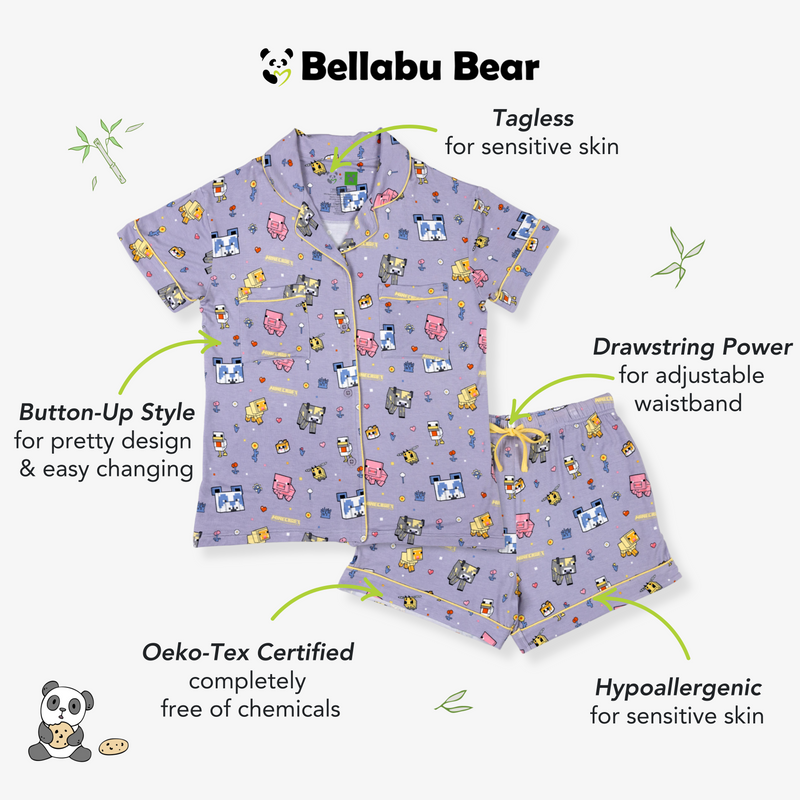Level up your loungewear with the Minecraft Pixel Pals Bamboo Women's Pajama Short Set—where comfort meets the pixel-perfect world of Minecraft. Crafted from ultra-soft, breathable bamboo fabric with a touch of stretch, this pajama set is designed to move with you through every cozy quest. The short-sleeve top and drawstring shorts keep you cool and comfy whether you're building dream worlds or relaxing in the real one. With a playful Pixel Pals print and eco-friendly materials, it's the perfect blend of fun, function, and sustainability. Hypoallergenic, moisture-wicking, and Oeko-Tex certified, this set is ideal for sensitive skin and sweet dreams. Sleep, lounge, or play—this is your new favorite uniform for overworld adventures and well-deserved downtime.