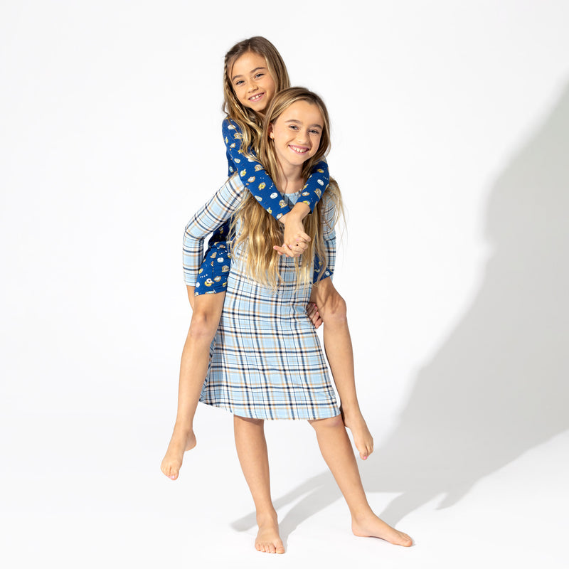 Introducing our Holiday Plaid Blue Bamboo Girls' Long Sleeve Dress – the perfect blend of cozy comfort and festive style for your little one this holiday season! This delightful pajama dress combines the softness of bamboo fabric with a charming blue plaid print, making bedtime and lounging extra special during the holidays. It's designed with both comfort and style in mind. The long sleeves keep your child warm, and the easy-on, easy-off design makes dressing a breeze. Whether it's for a cozy night's sleep or opening presents on Christmas morning, this pajama dress is the ideal choice.