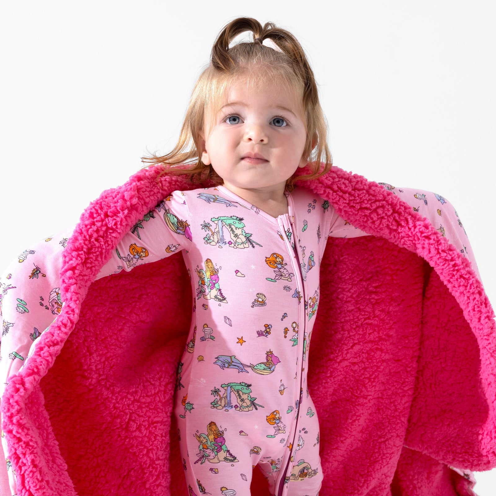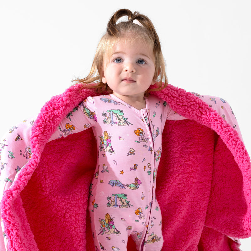 Wrap your little ocean explorer in the cozy magic of the Mermaid Lagoon Bamboo Sherpa Blanket—where softness meets sea-inspired charm! This generous 45 x 60-inch blanket features a luxurious double-layer design with silky-smooth bamboo rayon on one side and fluffy sherpa on the other, perfect for cuddling up after a day of underwater adventures. Oeko-Tex certified and free from harmful chemicals, it’s as safe as a hidden lagoon and gentle on delicate, seashell-soft skin. Breathable, thermo-regulating, and moisture-wicking, this eco-friendly bamboo sherpa blanket keeps your child warm and comfortable no matter the tide or season. Plus, every purchase helps protect children, ocean creatures, and our planet, making this blanket a true treasure from the depths—snuggle up and let the waves of kindness wash over you!